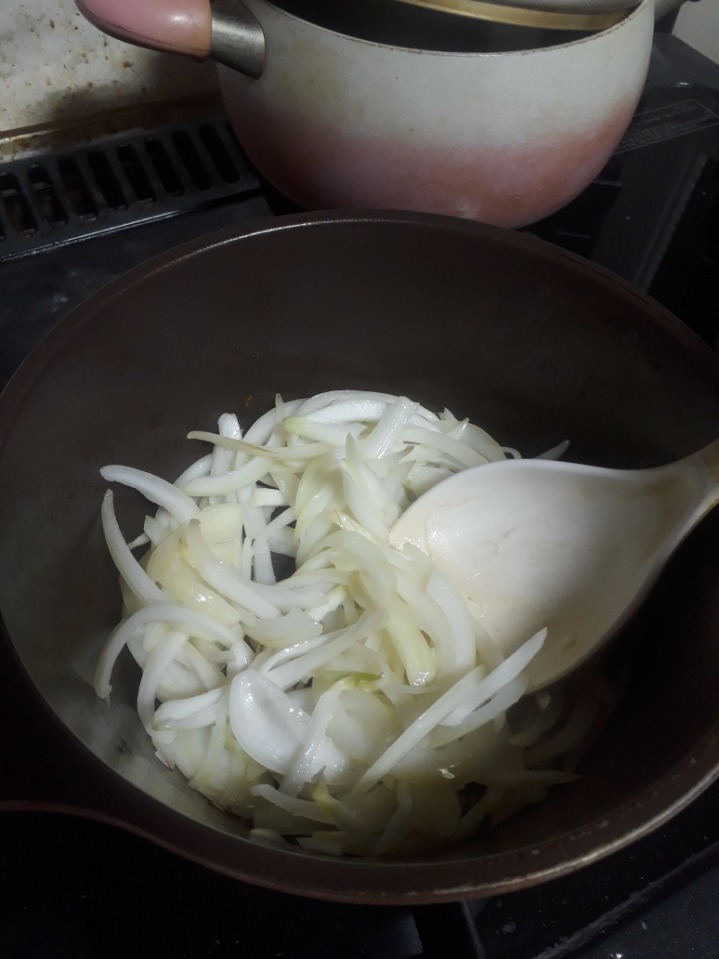 양파는 채썰어서 올리브나 식용유로 살짝 숨죽일만큼 볶습니다
