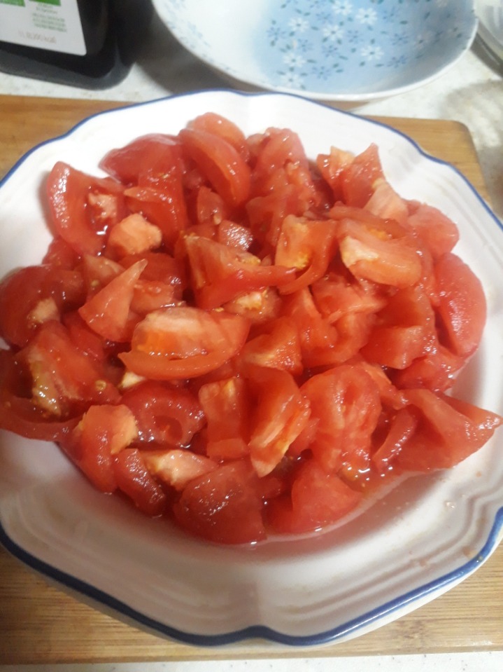 토마토는 칼집넣고 끓는물에 잠깐넣었다가 껍질을 벗겨 깍뚝썰어놓고