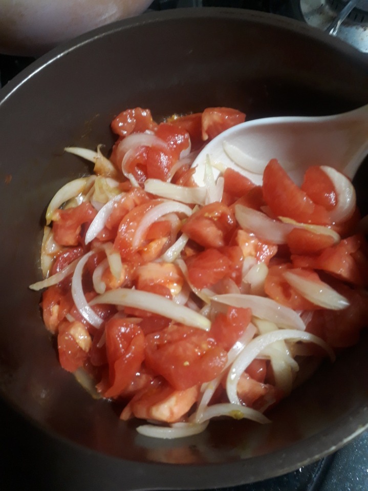 양파를 볶다가 썰아놓은 토마토를 넣고 함께 볶는데 이때