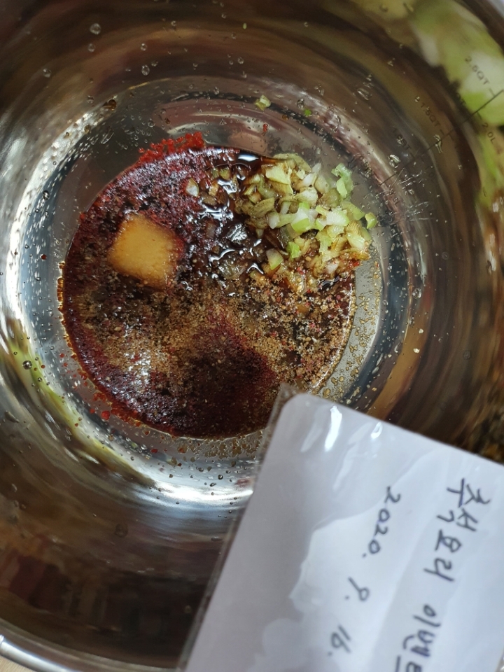 볼에 양조간장 다진마늘 다진파 물엿 고추가루 깨 참기름 물을 넣고 양념장을 만든다