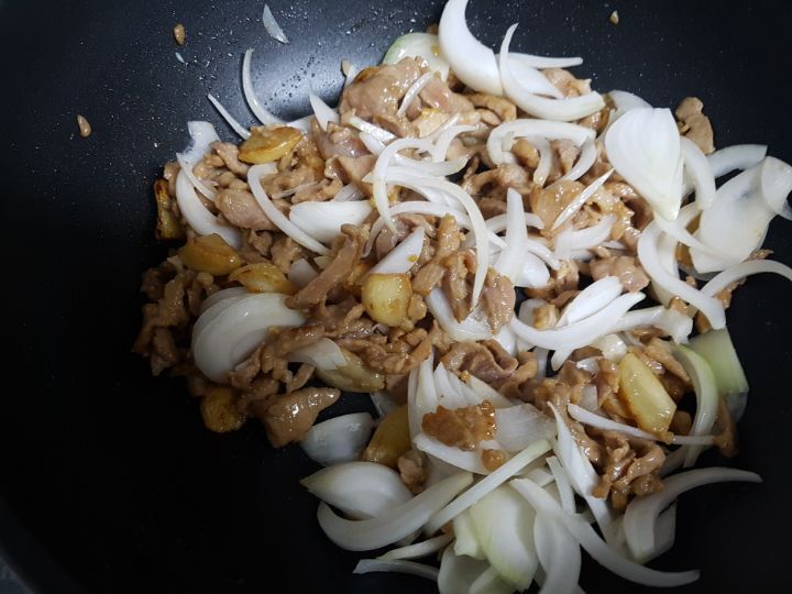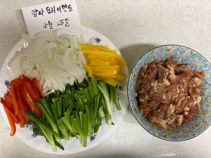 재료-양파와 돼지고기 부추 피망 마늘 굴소스