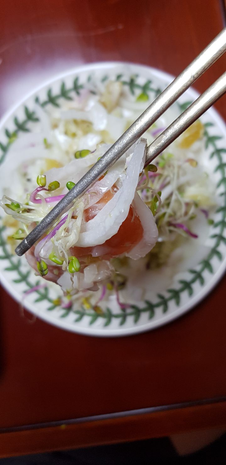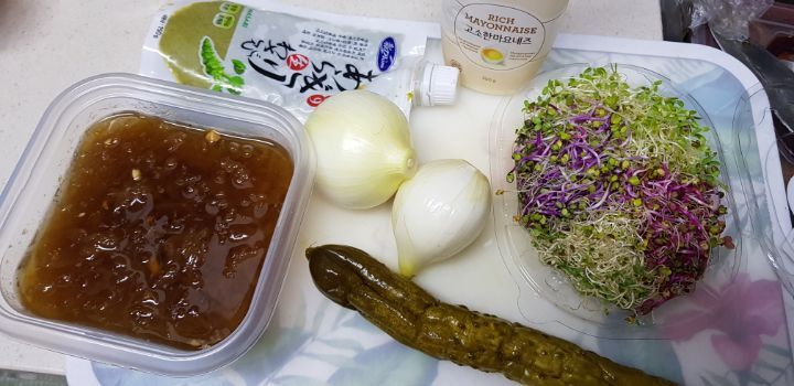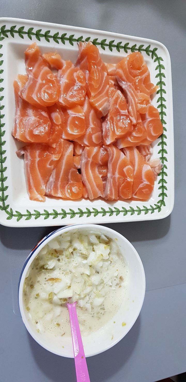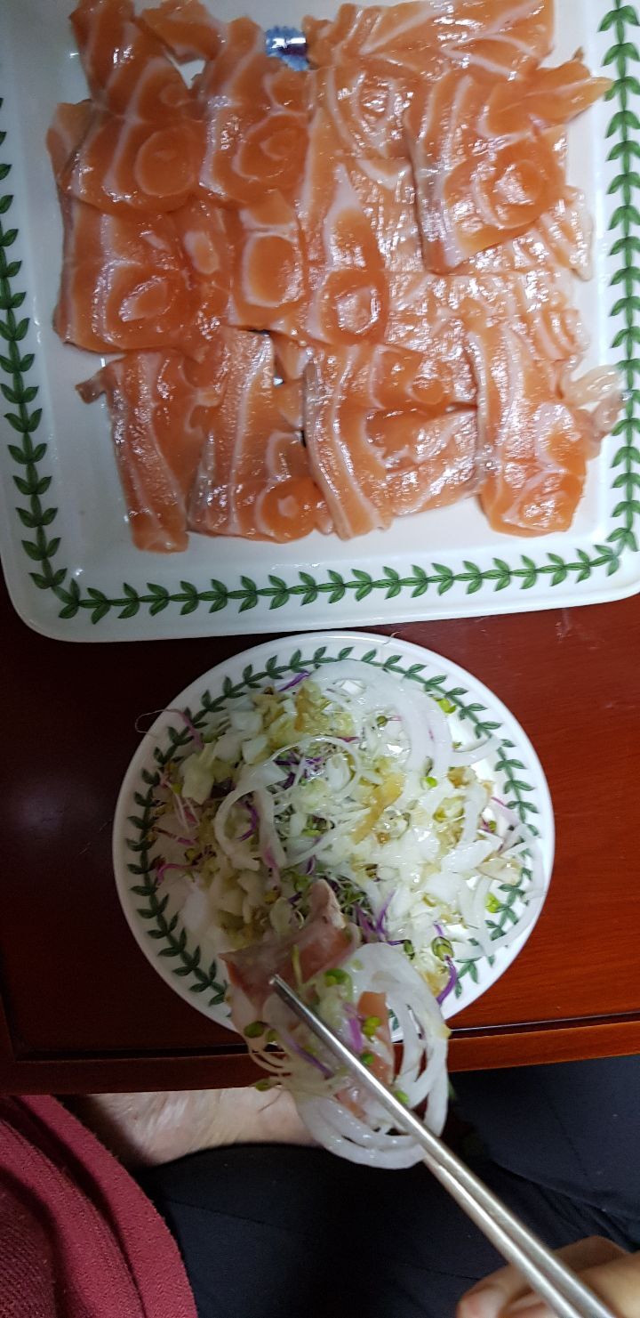준비물인 마요네즈와 양파와 파클다진 거 겨자 모두 섞어 놓구요 새싹순은 따로 연어회와 같이 먹지요