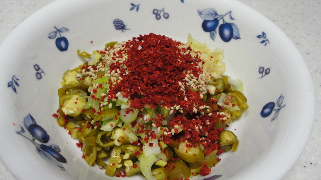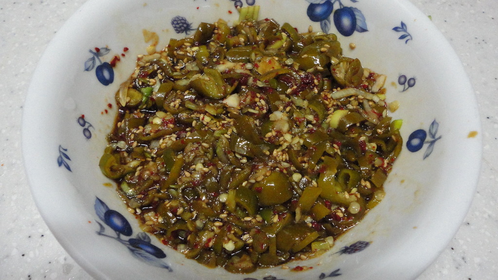 양념장 -지고추 .마늘 .파.참기름.깨소금 .고추가루 를 넣어 양념장을