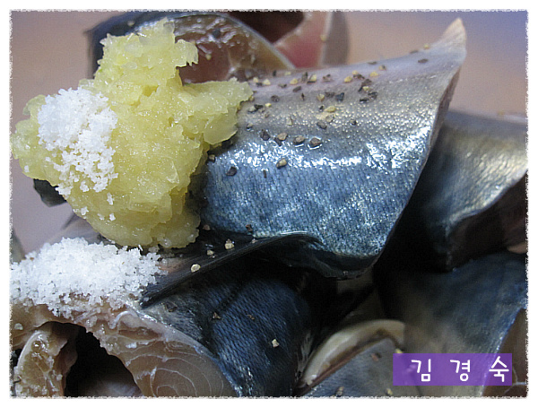 생고등에에 소금과 마늘, 청주를 뿌려서 재어줍니다..