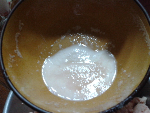 감자갈고 생긴 물은 가만 놔두면 밑에 전분이 생기죠. 같이 섞습니다.