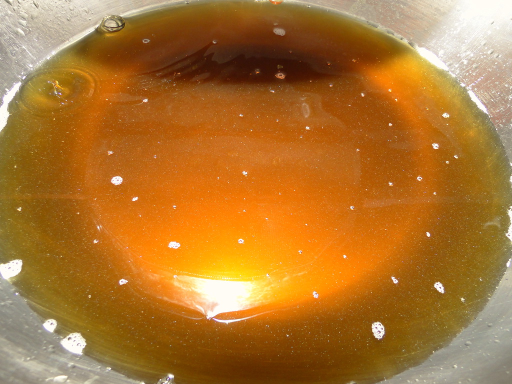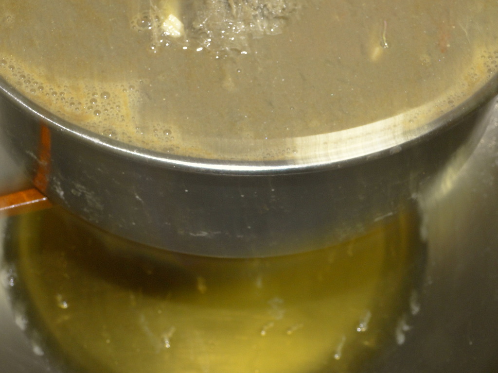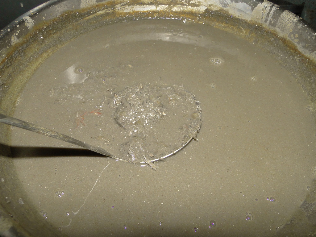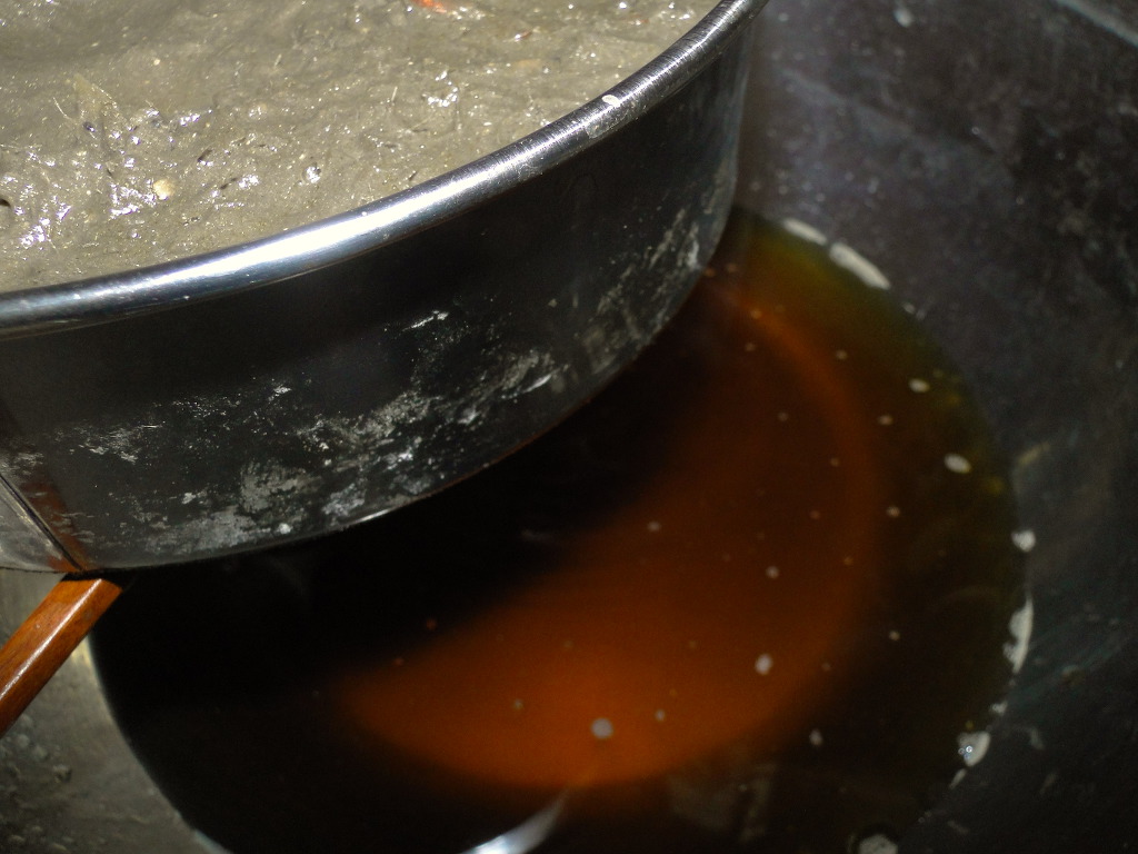 ↑작은 체에 끓인 젓을 떠 담습니다. 맨 처음에는 탁한 게 내려오는데 그런거 내려올 때는 팬위에서 잠시 들고 있으면 금방 맑은 것이 내려옵니다.