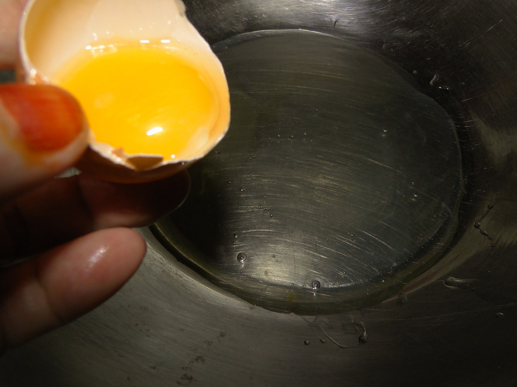 ↑달걀을 흰자만 그릇에 담고 ....