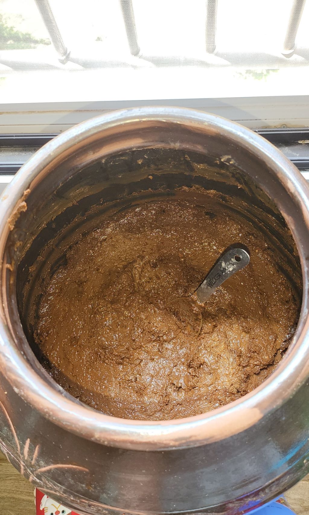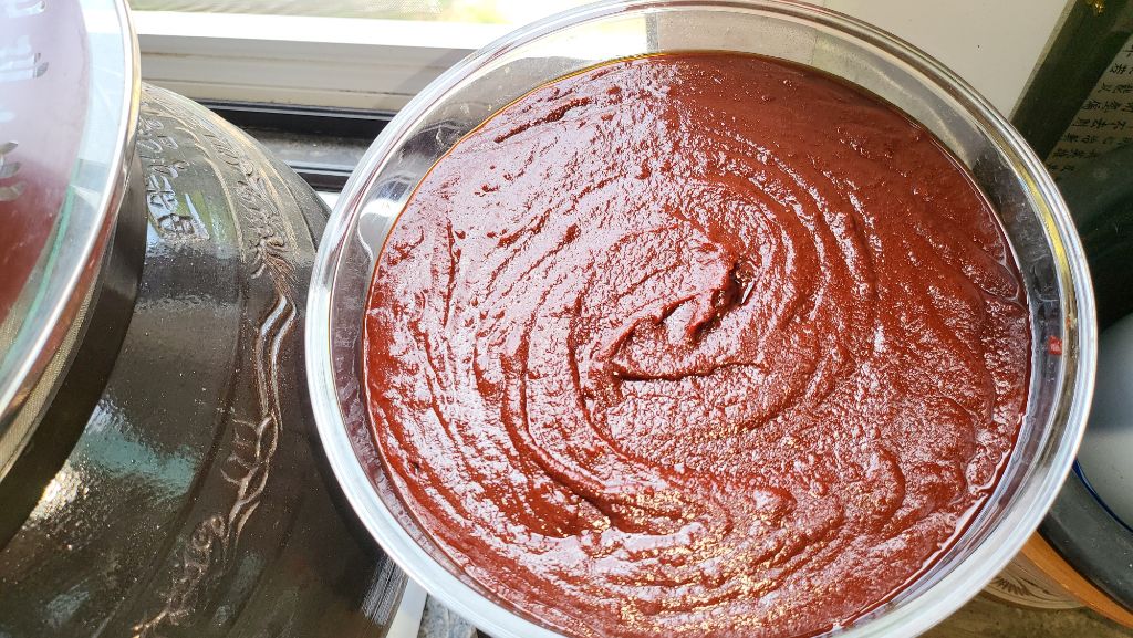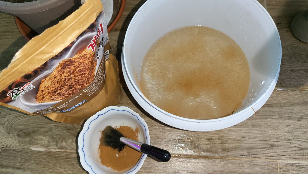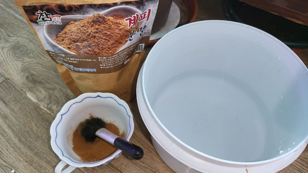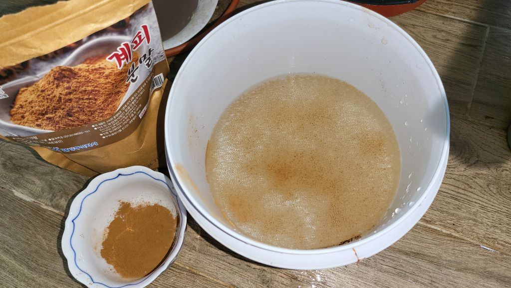 손댄김에 화분 물받이를 바꾸고 된장독 위에 다시 올려놓고... 고추장도 열어 봅니다.