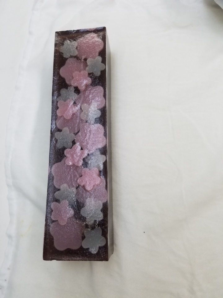 핑크와 흰색꽃잎을 형틀로 찍어서 팥소위에 얹어서 장식한후 아주 부드러운 한천가루로 투명한 젤리를 만들어서 장식한 꽃잎위에 한스푼씩 고르게 넣어줍니다. (냉동실에서 30분 굳힌다)