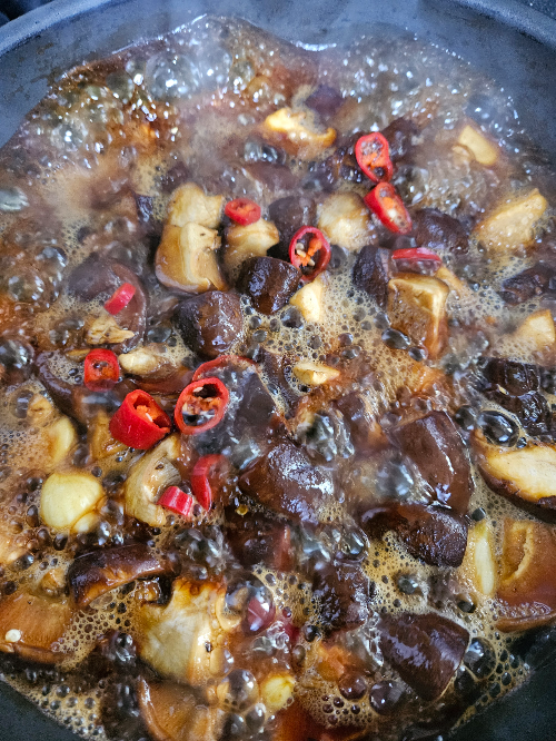 버섯을 넣고 중불에서 뒤적이며 졸입니다.