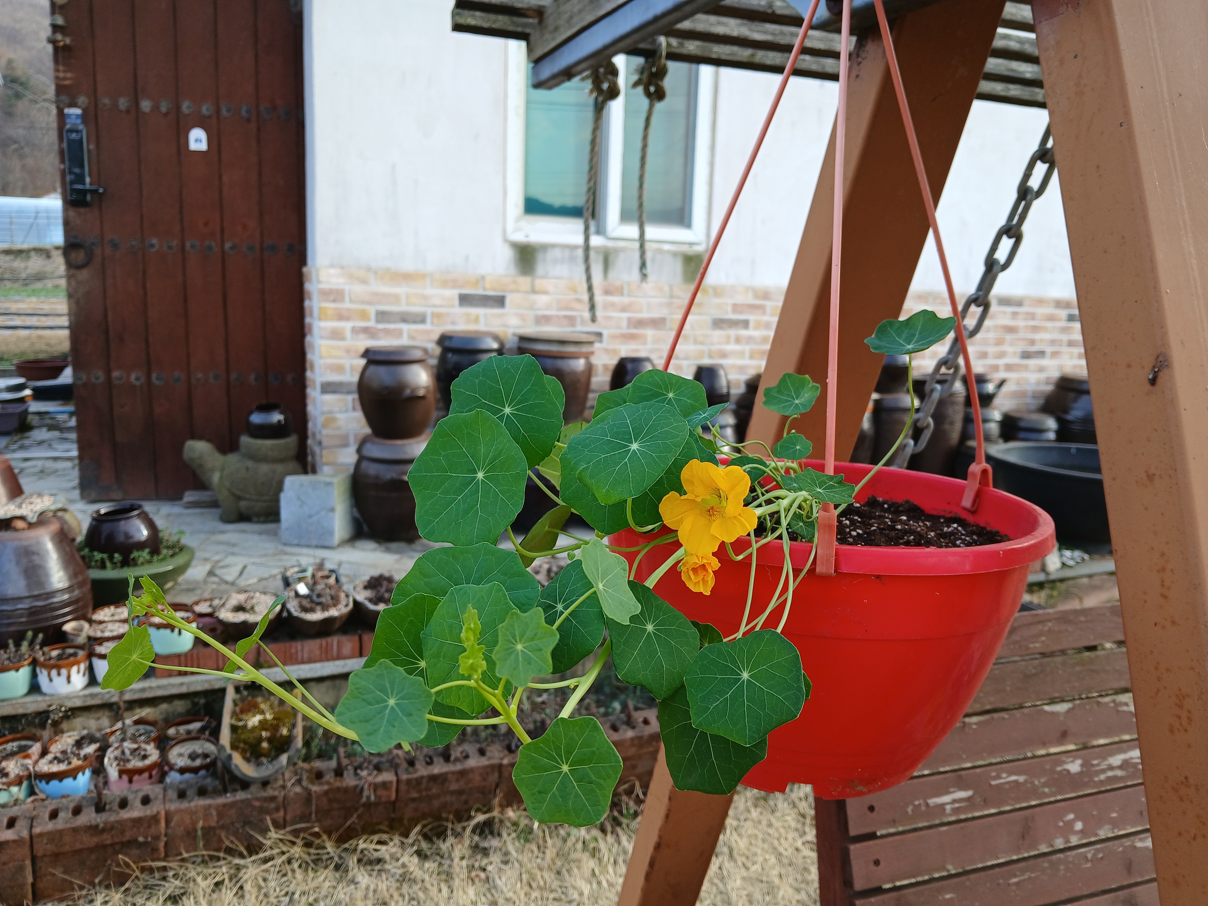 바로 한달 전쯤 겨울에 강화로 시집 온 련화예요. 한련화!