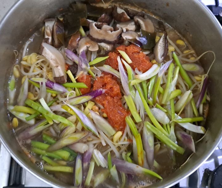 육수에 양념장 넣고