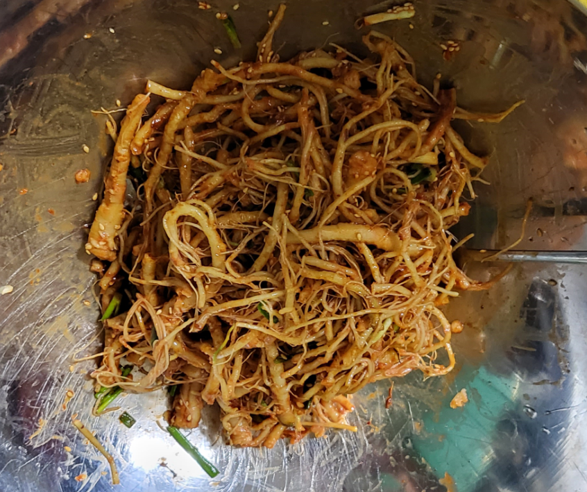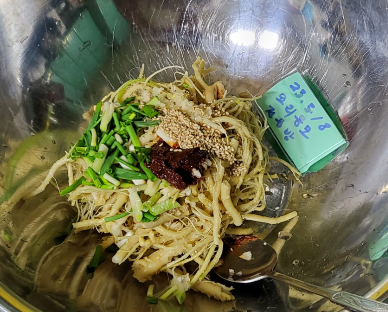 보리고추장 식초 당유자청 다진마늘 숭숭썬쪽파 통깨 식초 참기름 넣고 조물조물 했어요