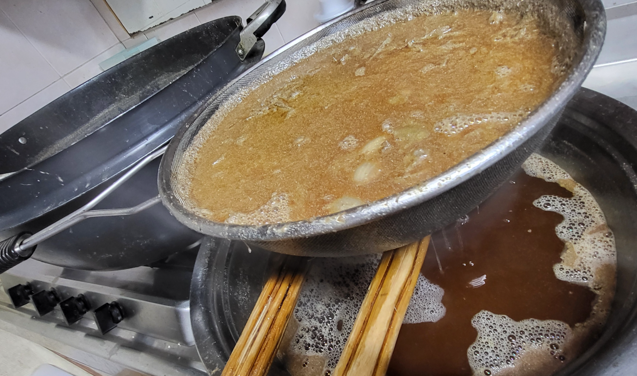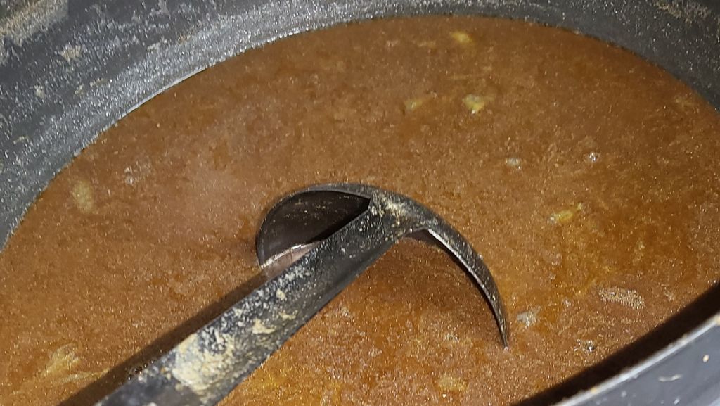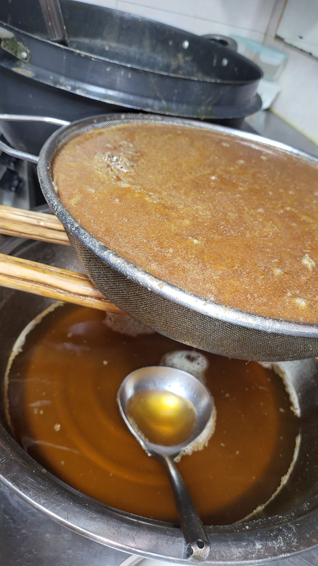 처음에는 혼탁한 국물이 조금 내려오는데 그건 다시 솥에 붓습니다.
