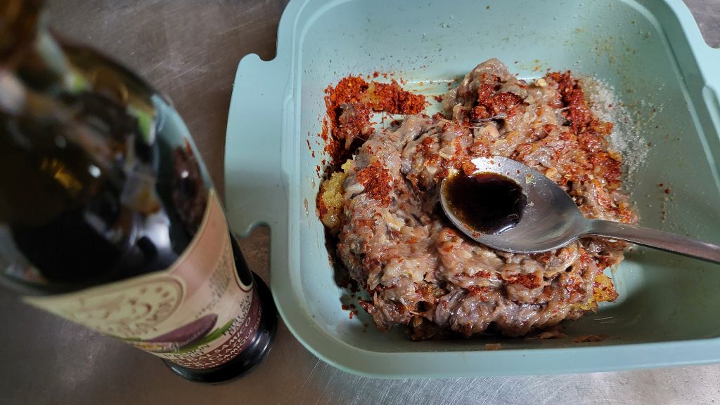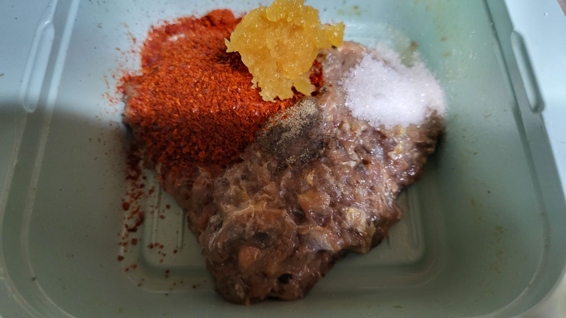 고기의 뼈를 발라내고 다져서 양념을 했습니다.