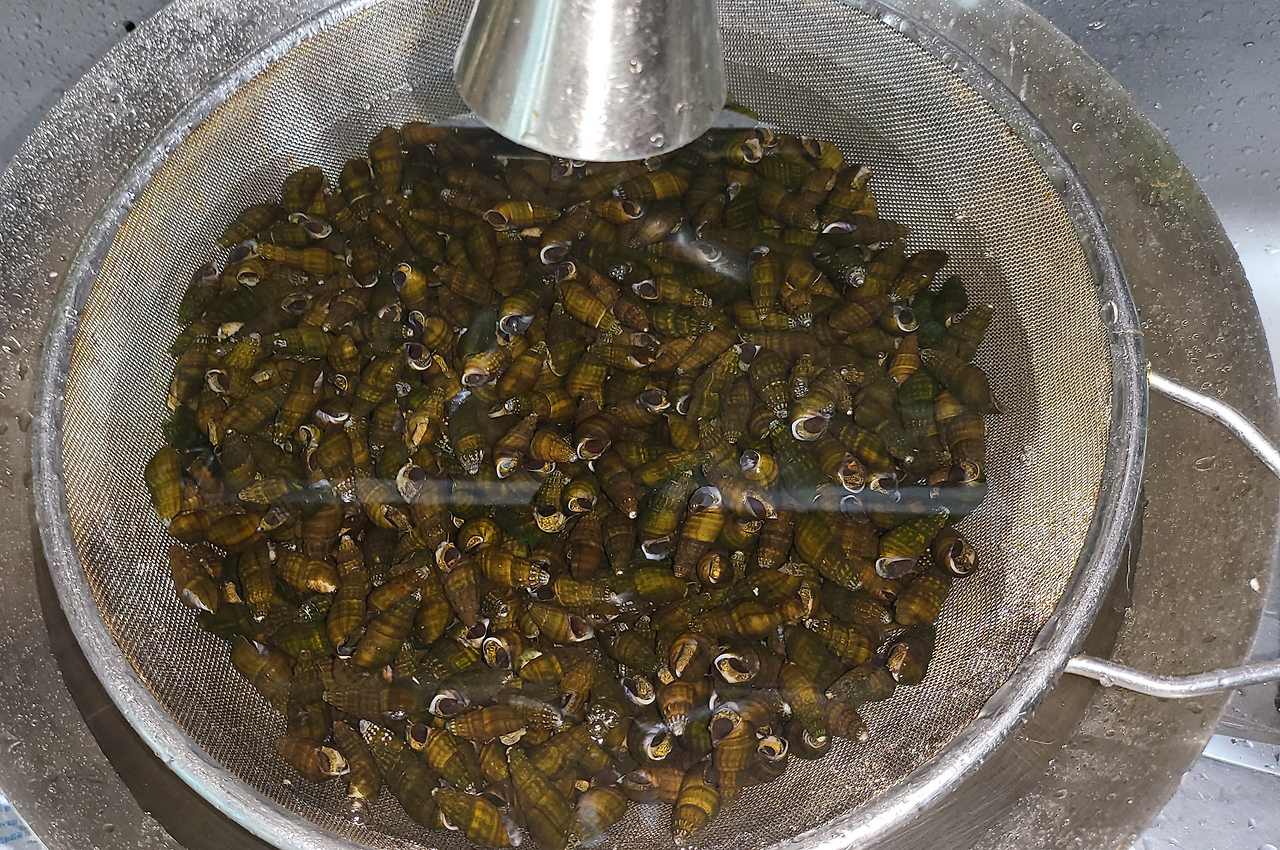이때 충격이 있으면 다슬기 몸이 다 들어가 버리니 조심조심 살그머니 들어 올려 끓는 국에 넣습니다.