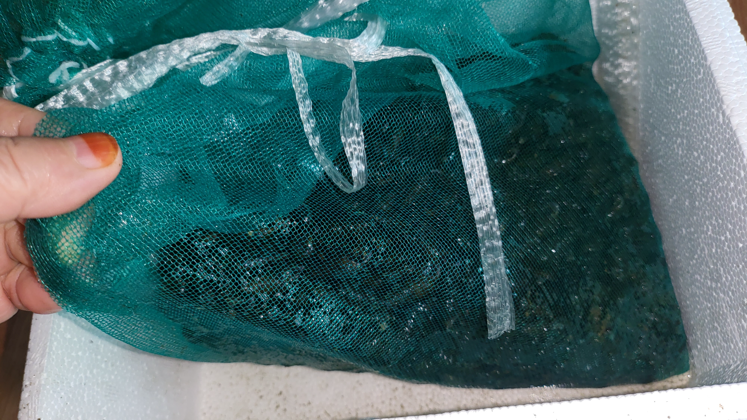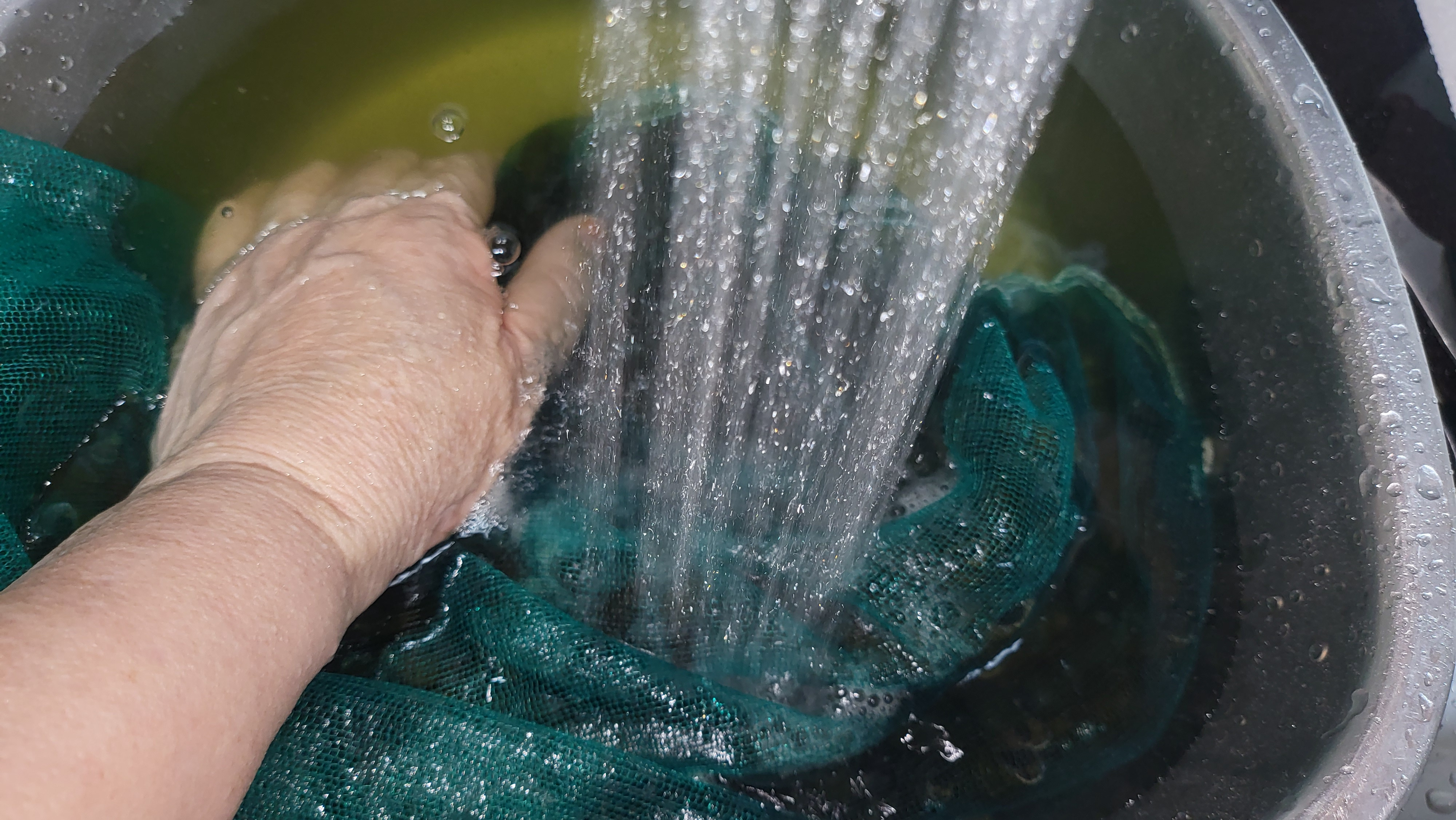 망에 담긴째로 빨래 빨듯 두 손으로 문지르면 겉에 묻은 이끼가 잘 벗겨집니다.