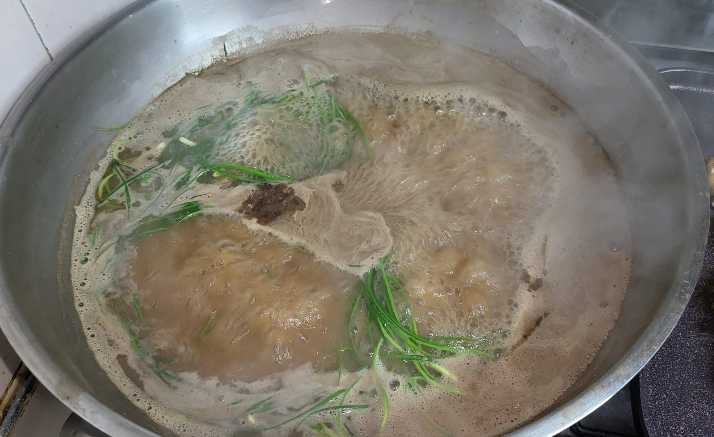 국물에 된장을 풀고 파 마늘을 넣어 국물을 맛있게 만듭니다. 저는 부추도 조금 넣었습니다.