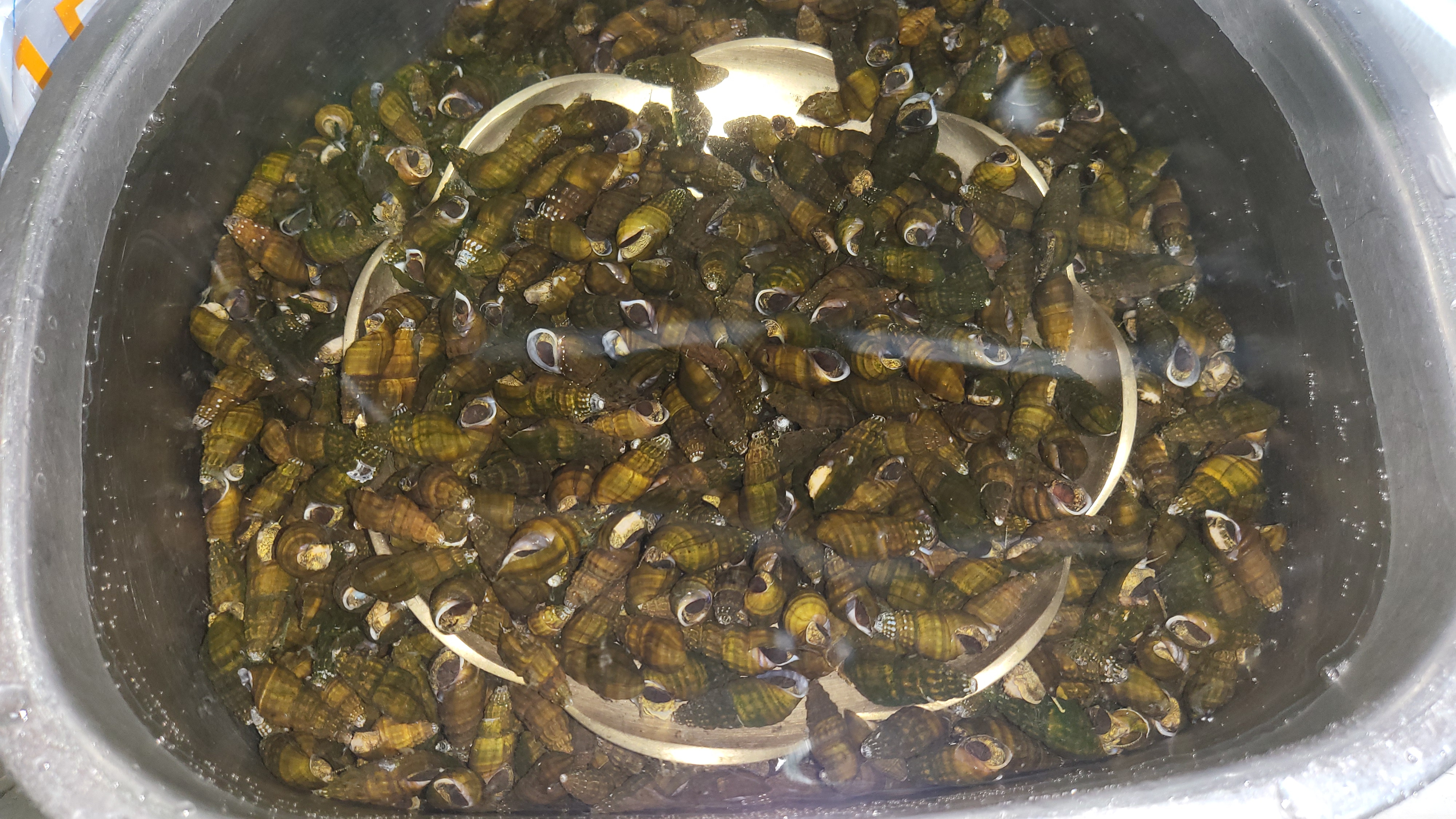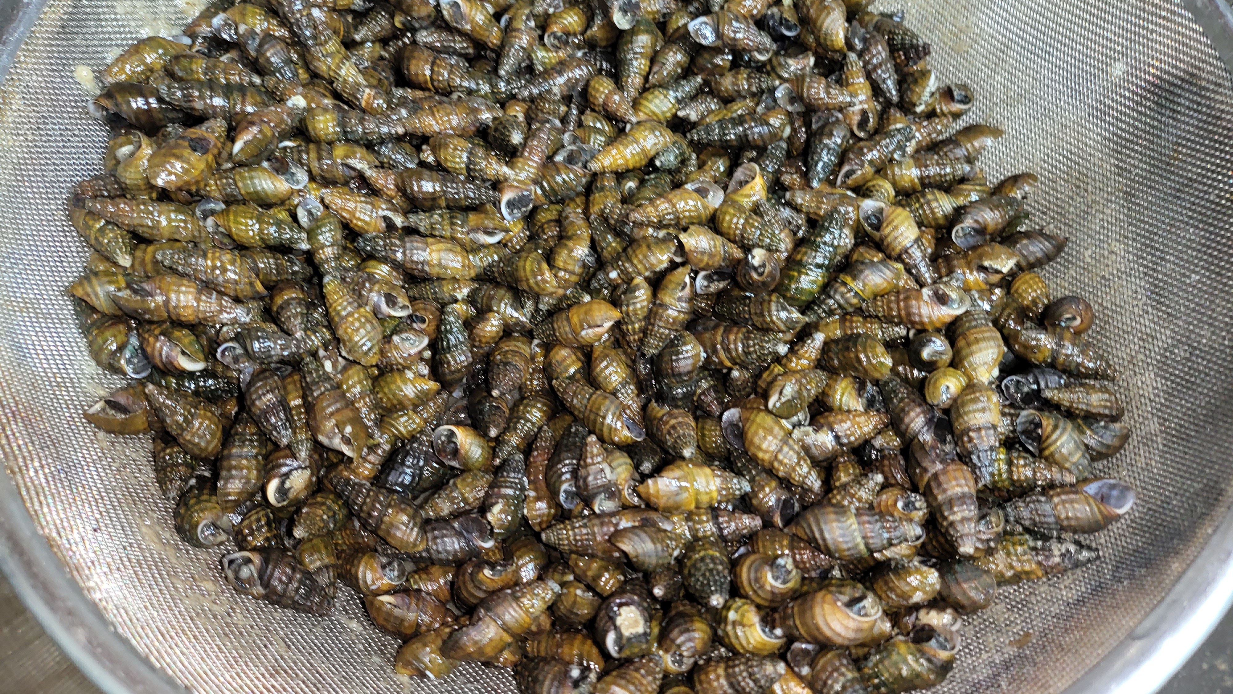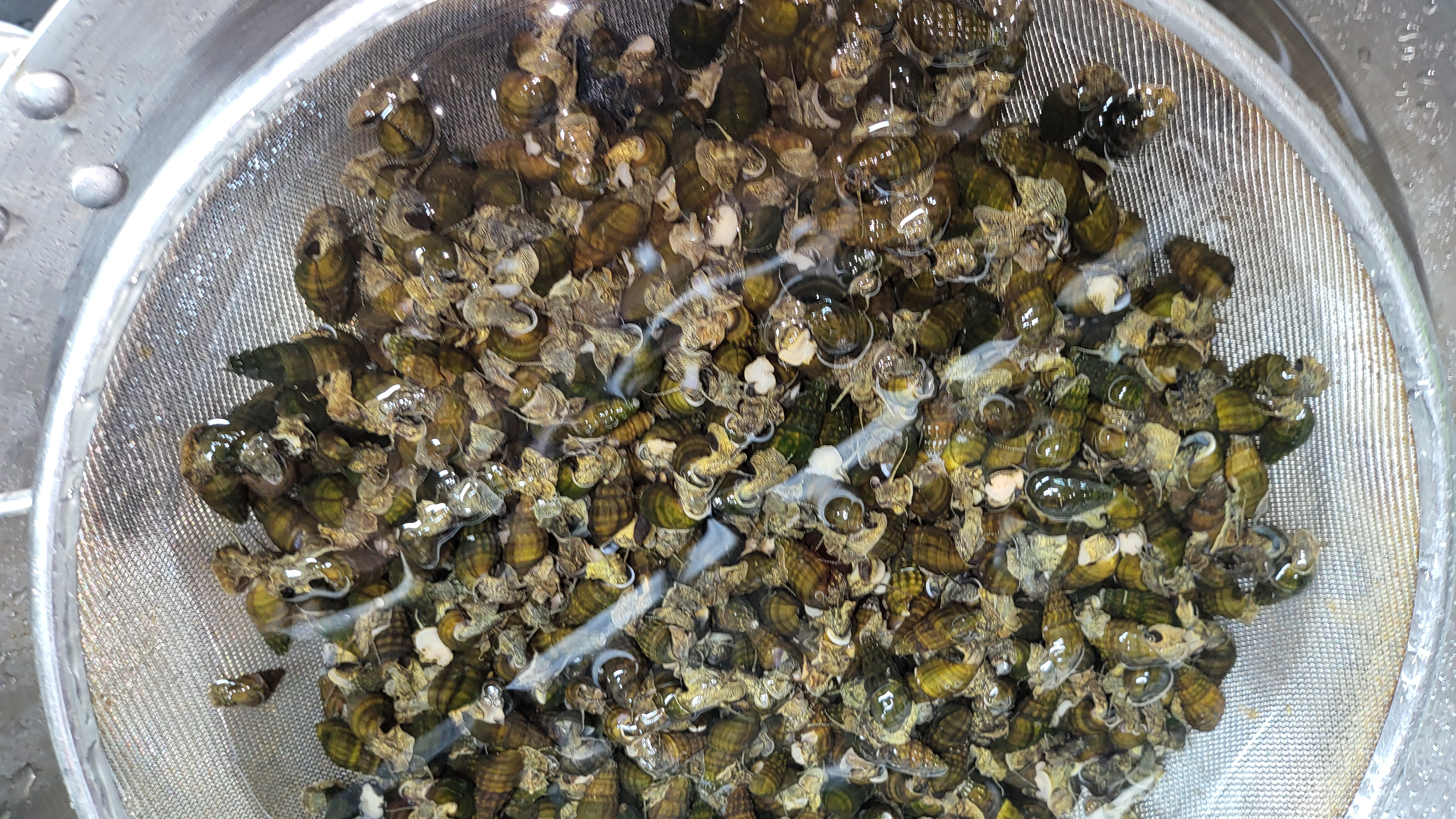 20 분쯤 끓여 거름망을 들어냈는데... 다슬기 살이 속으로 들어가지 못하고 걸쳐있는 게 보입니다. 이래야 다슬기를 까기가 좋습니다.
