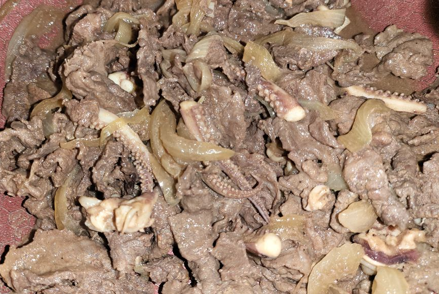 양념한 소고기를 먼저 익힌 다음 양파와 오징어를 넣습니다.