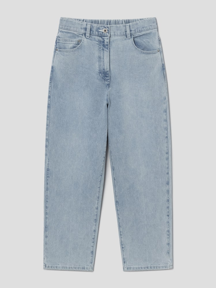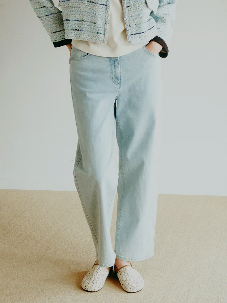 제품특징 : 슬림 배기핏으로 세련된 실루엣을 연출하는 데님 팬츠입니다.