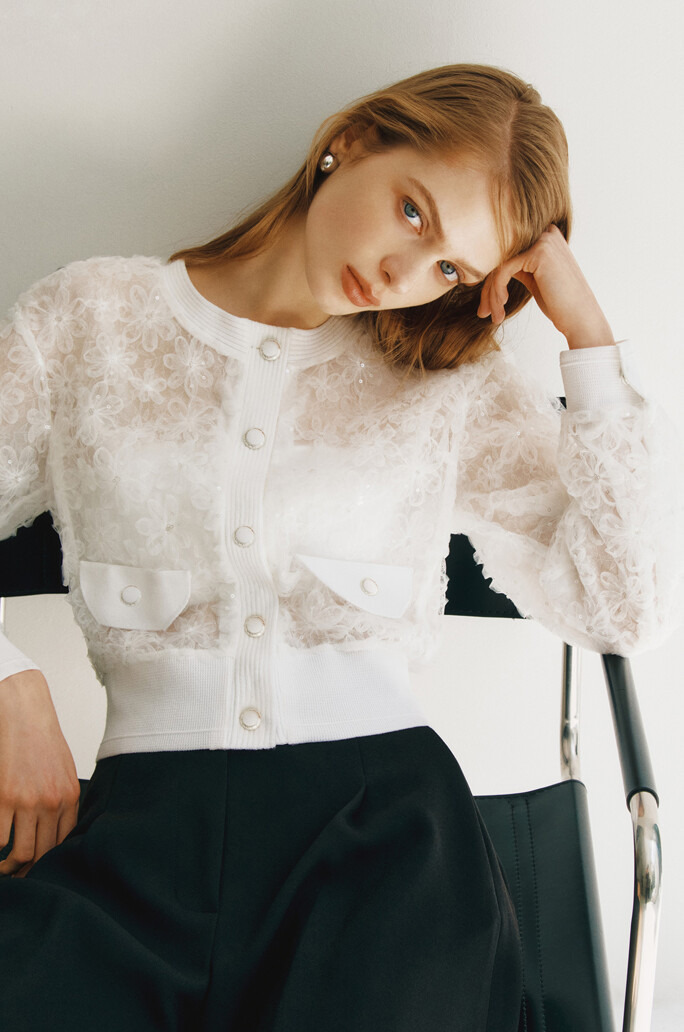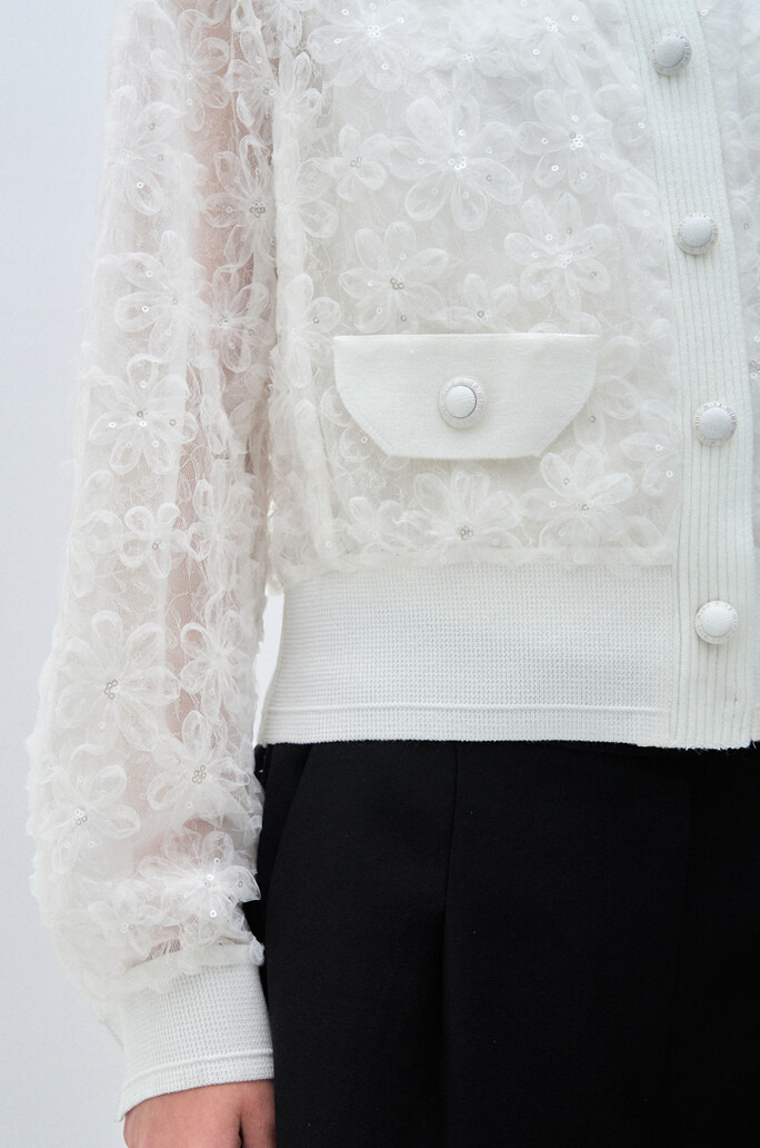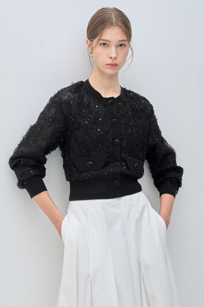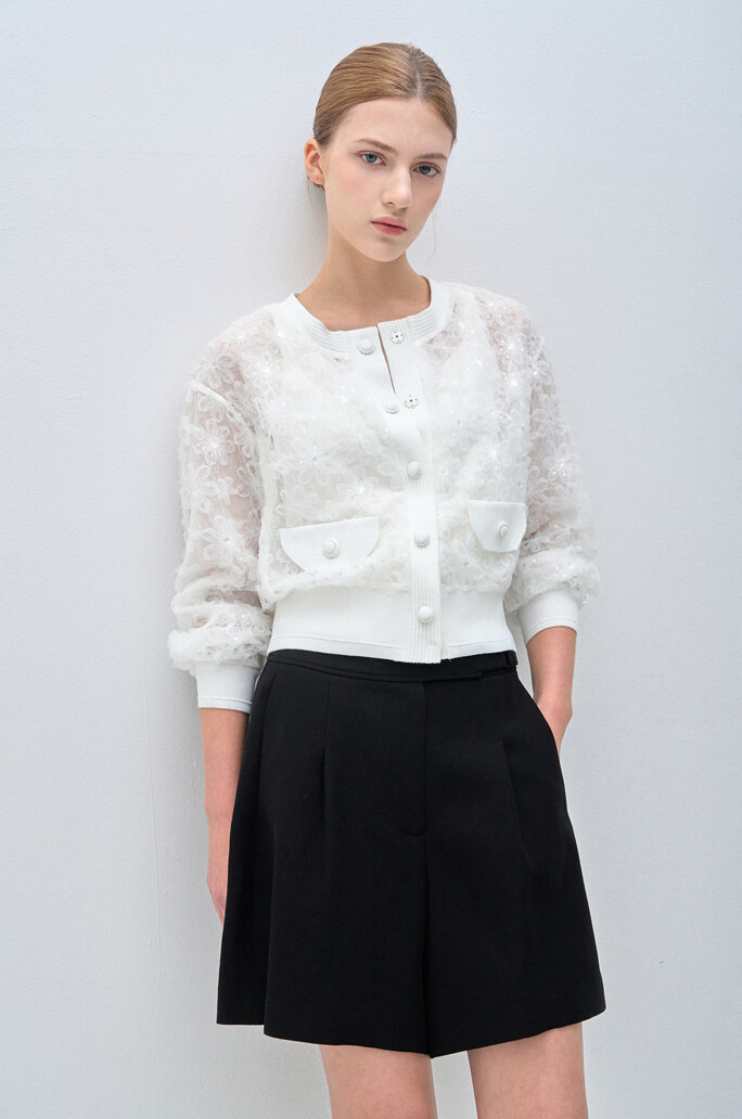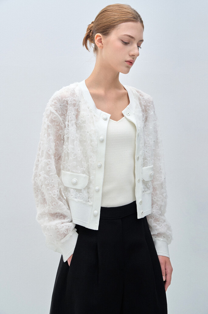 제품특징 : 이탈리아 수입원단의 섬세한 플라워 모티브의 은은한 반짝임을 자아내는 크롭 자켓입니다.