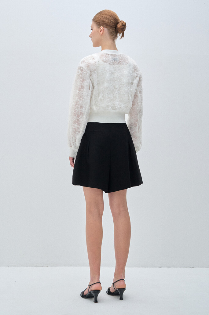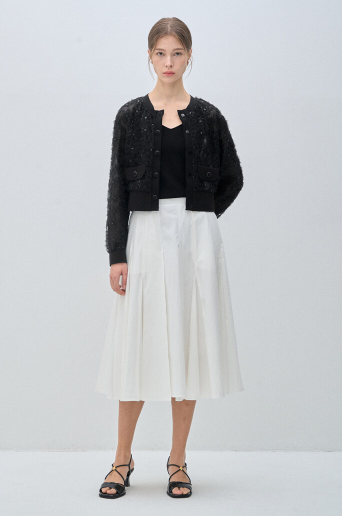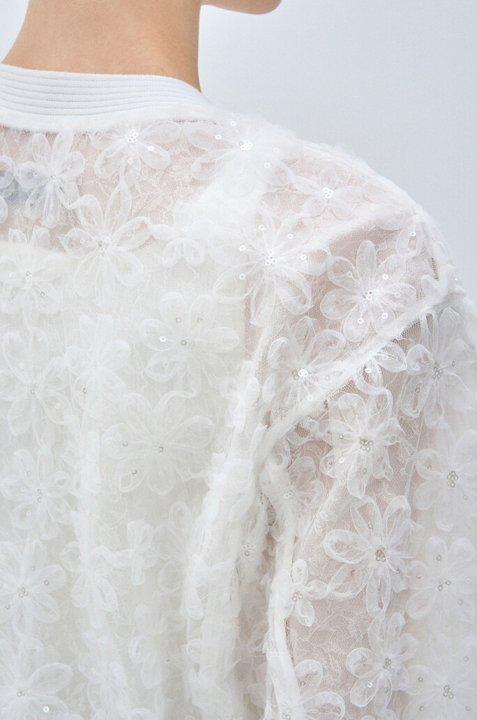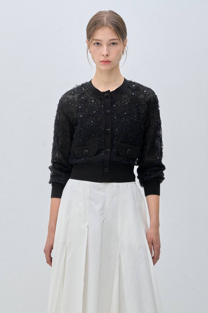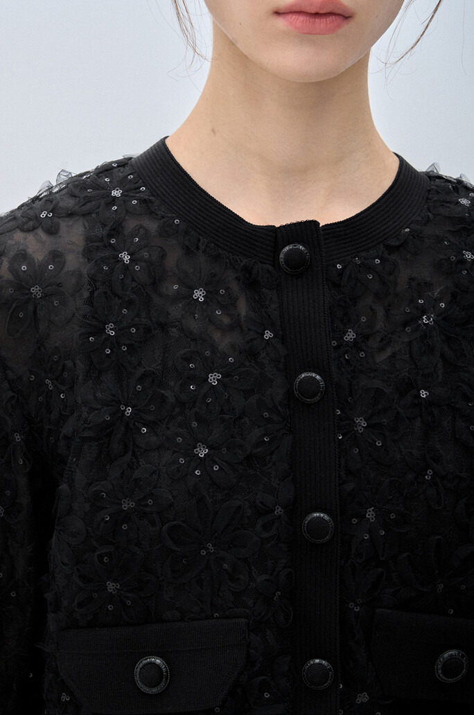 제품특징 : 이탈리아 수입원단의 섬세한 플라워 모티브의 은은한 반짝임을 자아내는 크롭 자켓입니다.