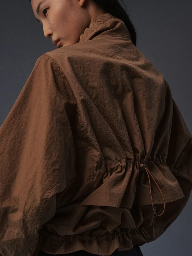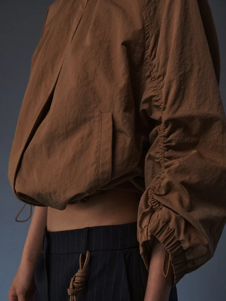 네크와 소매, 뒤 덧장의 스트링으로 포인트를 더해 체형에 맞추어 세련된 연출이 가능합니다.