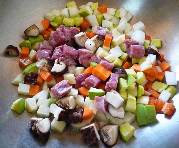 표고버섯과 삐져썰은 무도 함께 볶습니다.