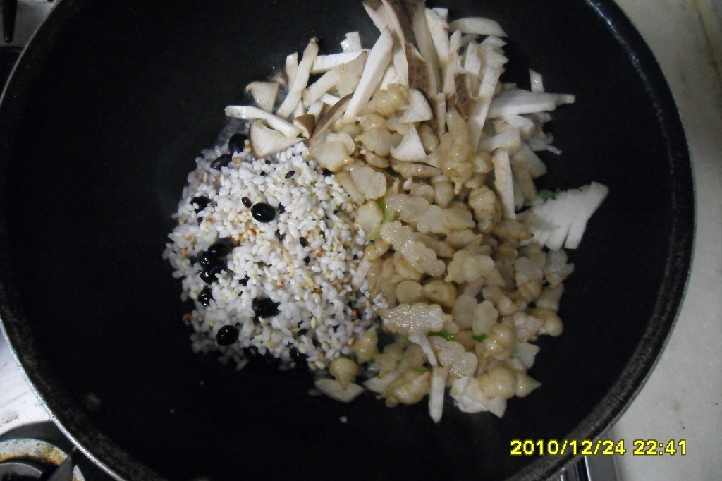 2. 가스렌지위에 불을 약간만 세게하여 속이깊은 팬에 참기름을 두르고 불린쌀, 새송이, 초석잠을 넣고 볶아준다