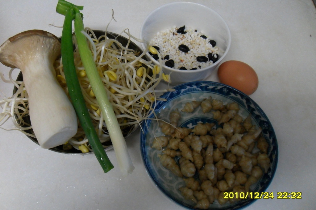 재료 : 불린쌀. 콩나물 . 초석잠. 새송이버섯. 양념장(간장, 고추가루, 파 ,마늘 참기름, 깨 ) 계란. 김