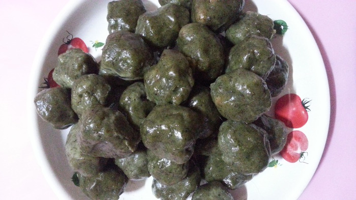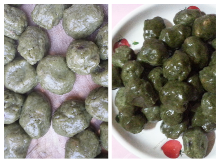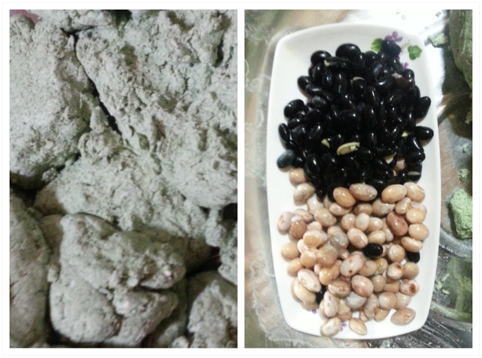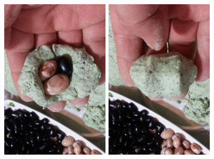 불린콩을 가지고 반죽한 쑥에다 콩 서너개 넣고 송편식으로 만들었어요
