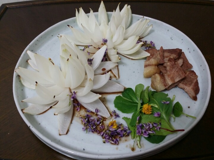양파를 3/4 까지 6 등분이나8등분으로 자른다음 200도 예열 안한 오븐에 12~15분 구어줌 연꽃처럼 예쁘게 벌어집니다. 홍양파도 구움 더 예쁘긴합니다