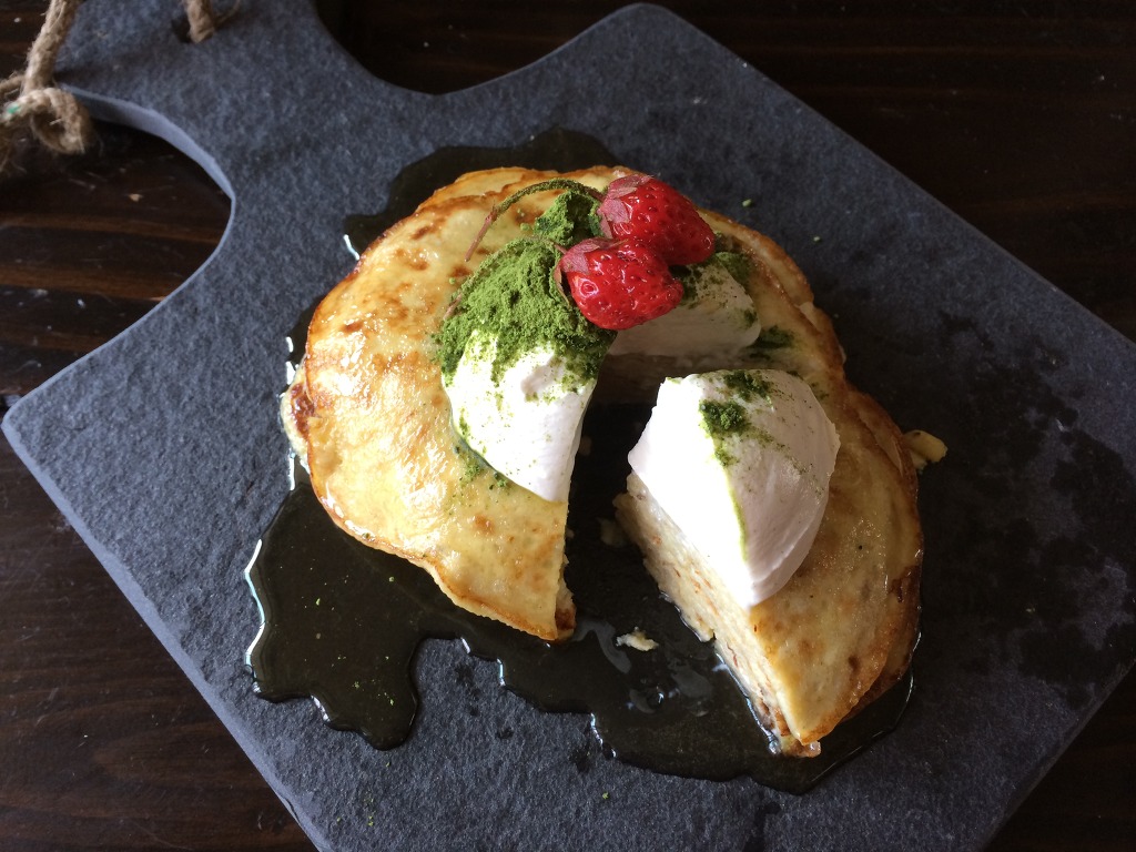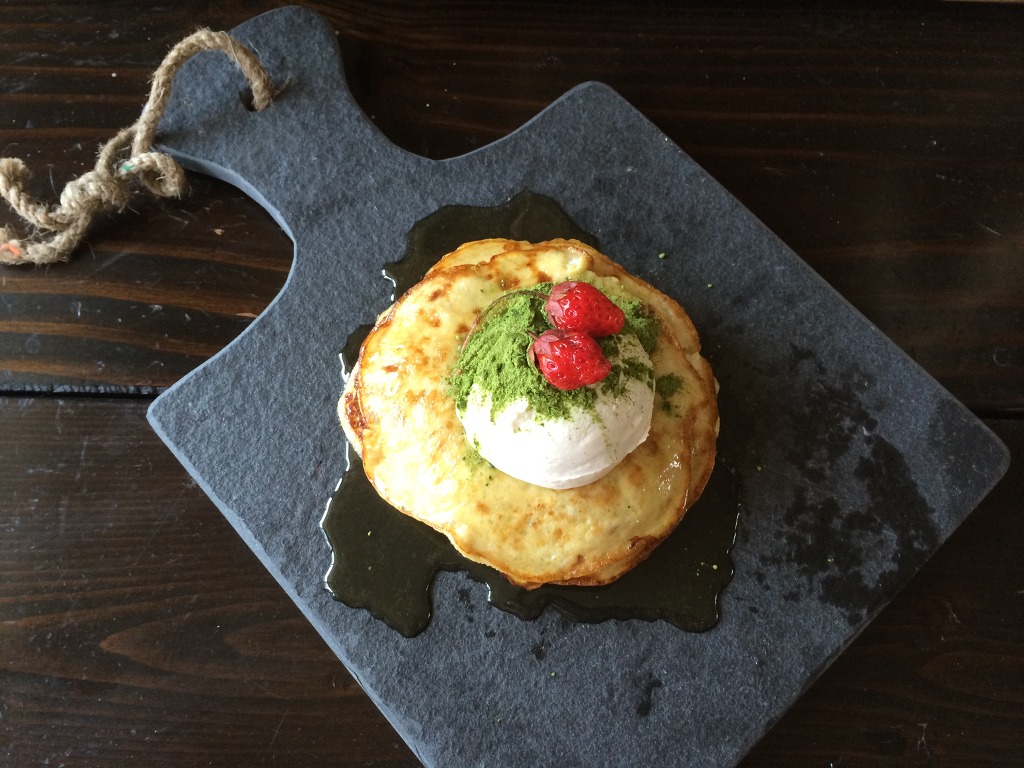 따뜻한 핫케이크에 차가운생치즈, 꿀이 달콤함을 더합니다