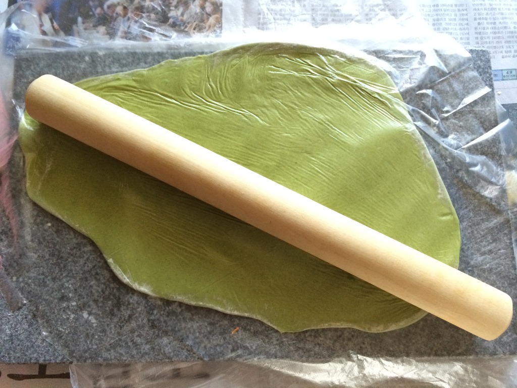 3. 숙성된 반죽을 홍두깨로 쓱쓱~펴 봅니다