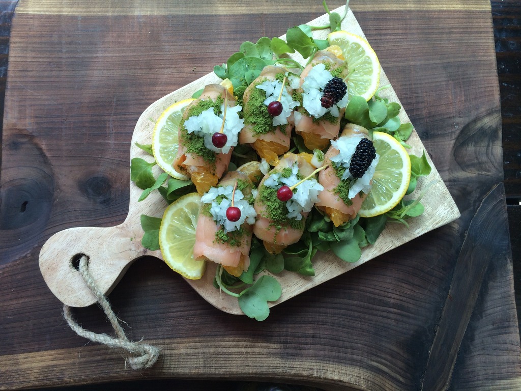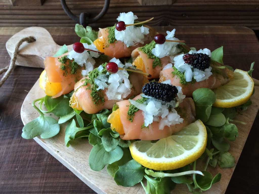 2. 새싹위에 껍질깐오렌지를 둘둘말은 훈제연어를 올리고