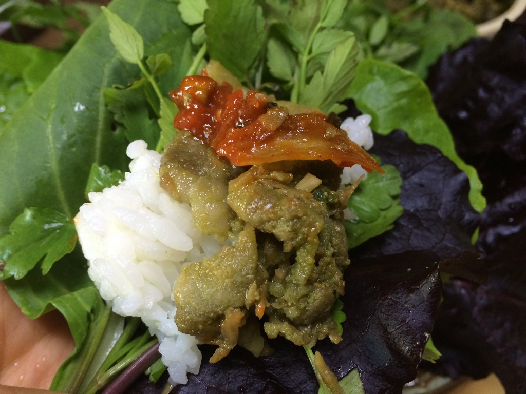 청경채깔고 적,청 상추 깔고 돌미나리 올리고 밥 얹고 고기한점얹고 집에서 양념한 쌈장 찍어