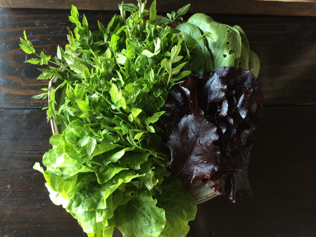 6. 집에 있는 쌈야채를 준비합니다 (김갑수님네 돌미나리, 친정엄마네 텃밭에서 딴 청경채, 적상추, 청상추)