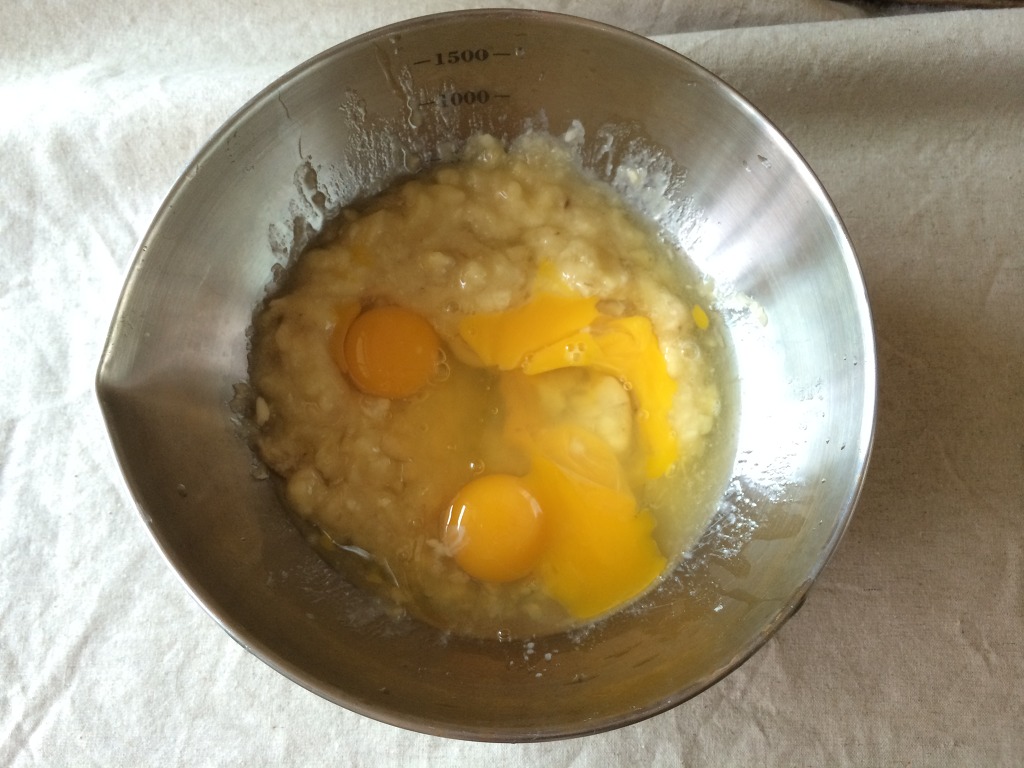 2. 바나나를 으깨고 계란을 넣어 반죽을 만듭니다