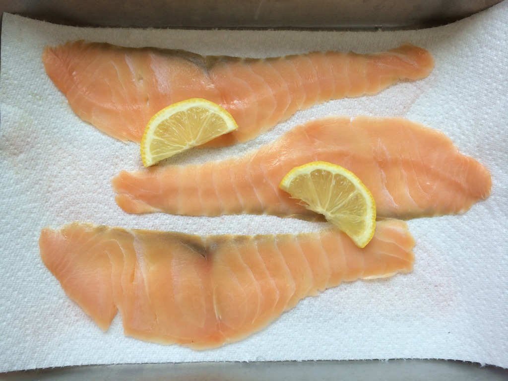 1. 시중에 파는 훈제연어를 키친타올에 한장씩 떼어 기름기를 빼줍니다