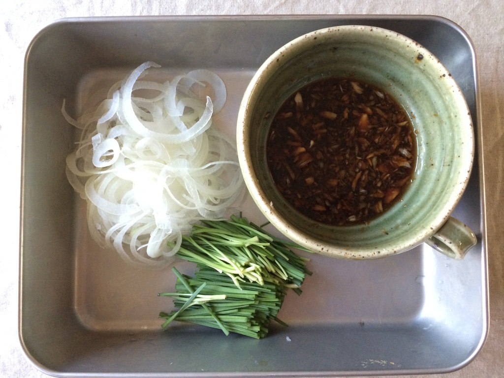 5. 그릇 위에 밥을 깔고--> 양파채를 깔고-->부추채를 깔고--->목살을 얹고--->소스를 뿌리고