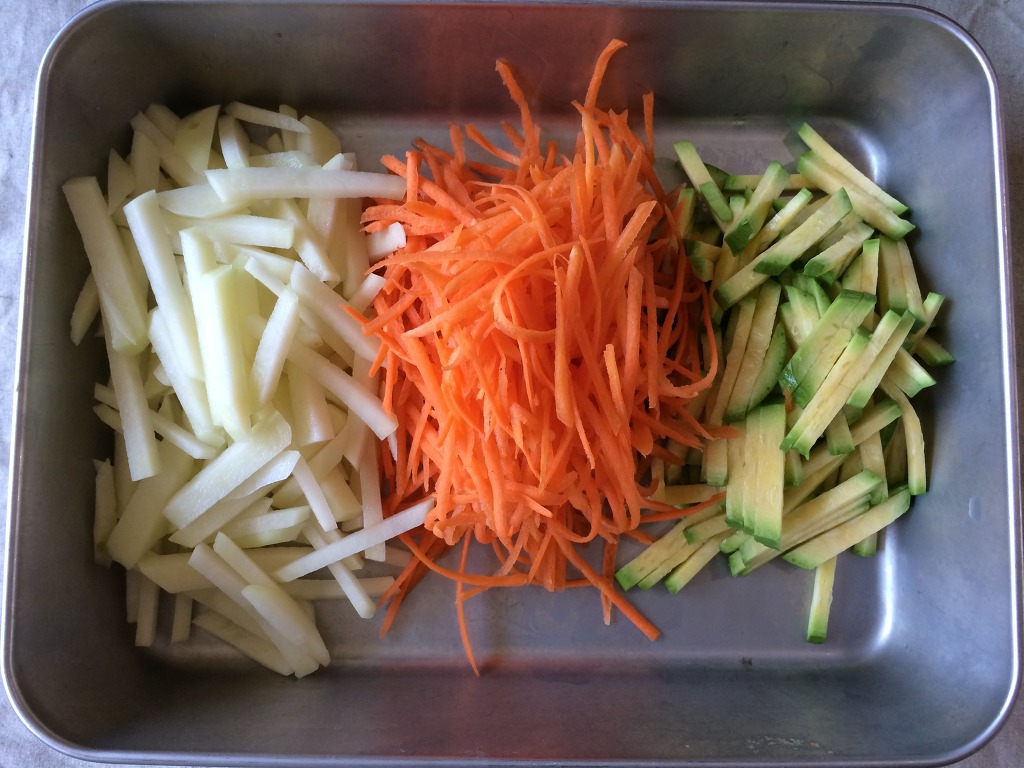 4. 육수를 끓이는 동안 갖은 야채(감자(황정숙님네), 애호박, 당근)을 채썰어 준비해주고요~