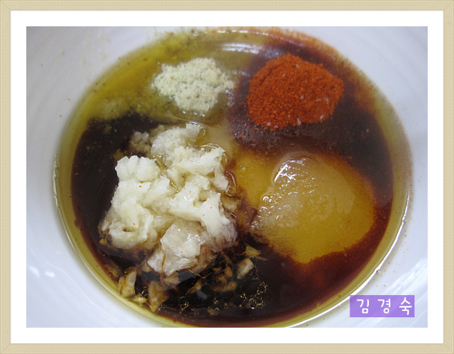 들기름 1큰술에 고운고춧가루 반큰술, 들깨가루 1큰술, 다진마늘,설탕1큰술