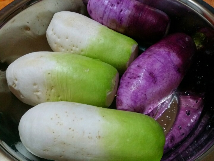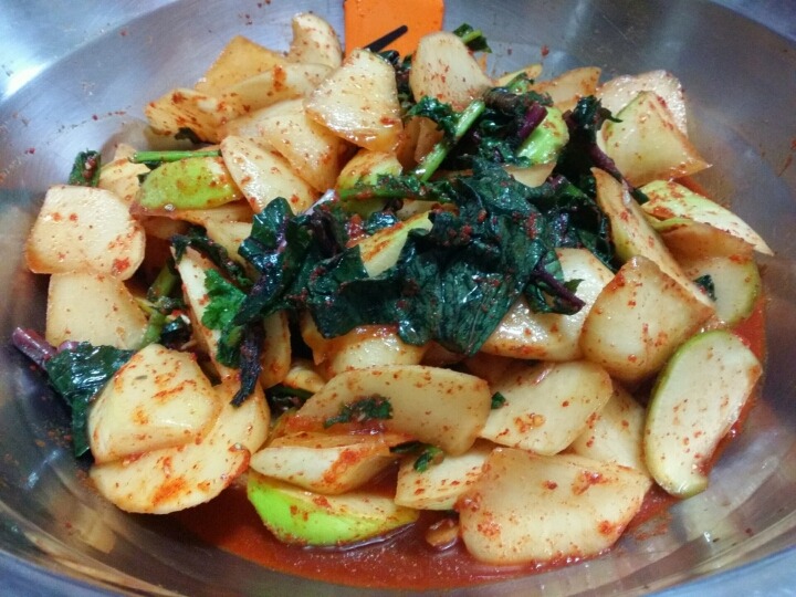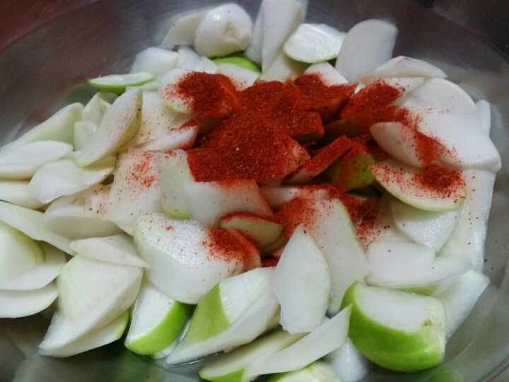 소금에 절궈진 무우에 고추가루 옷입혀 두고~