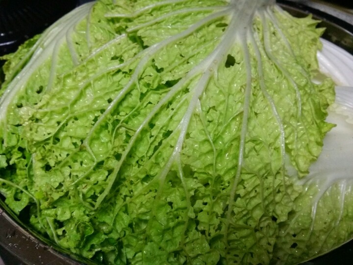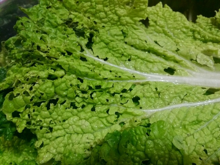 겉잎에 바람구멍이 숭숭난 석수농장배추입니다.