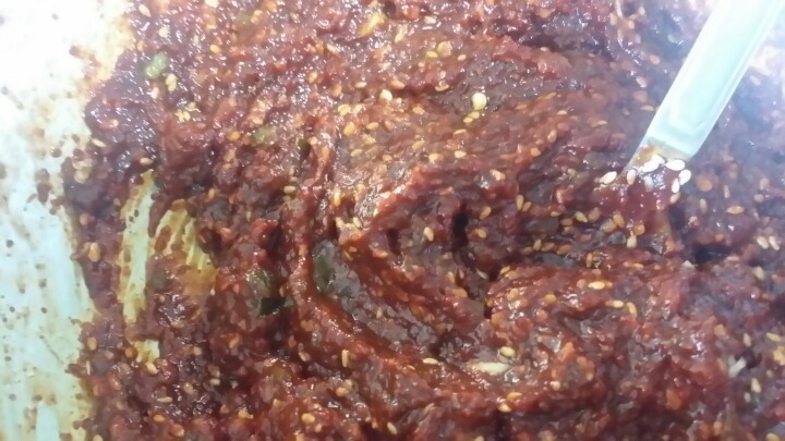 고운고추가루, 굵은고추가루, 고추장, 젖갈, 고추청,생강, 마늘, 깨를 넣고 양념장을 넣고 미리 만들어 숙성 시켰어요.