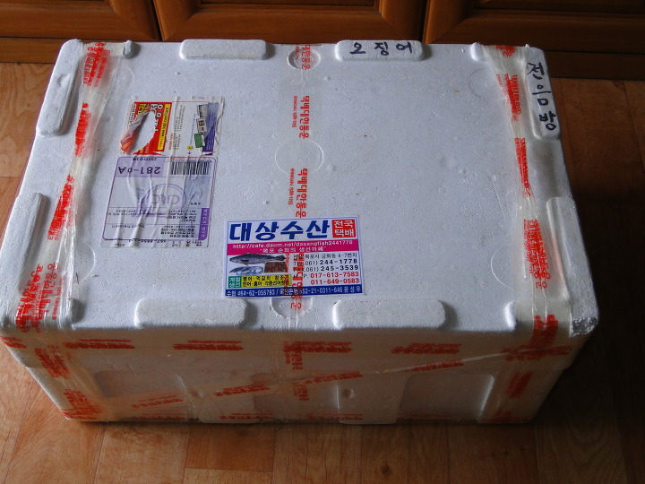 저 통이 80리터 짜리 큰 통이라 오징어 4짝 정도 들어가야 보기좋게 차는데...