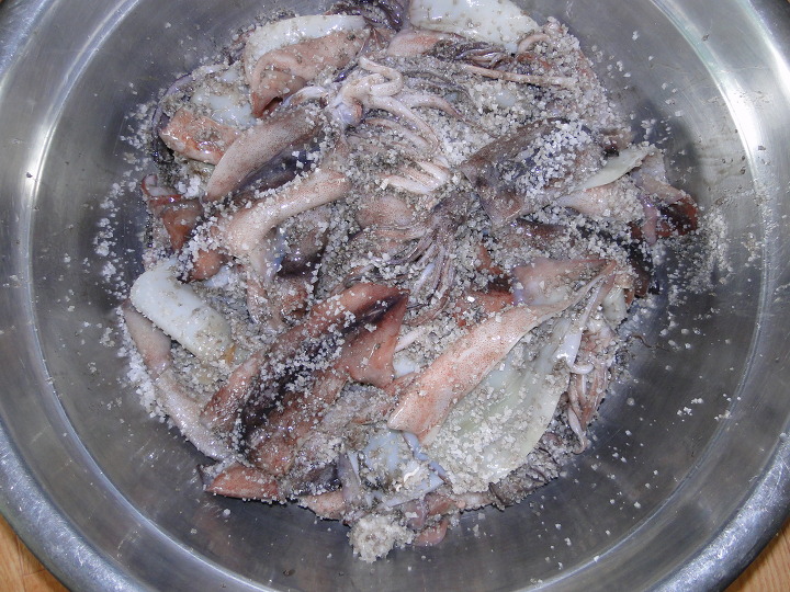 젓통에서 오징어를 꺼내면 소금이 많이 붙어있습니다.