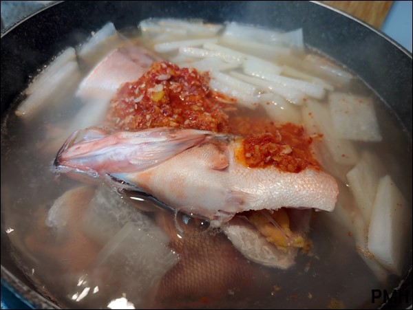 무가 얼추 익으면 손질된 생선과 양념을 넣고 팔팔 끓입니다.