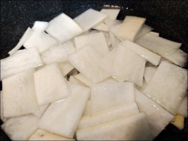 무 한토막을 나박나박 썰어 냄비에 물을 붓고 먼저 익힙니다.